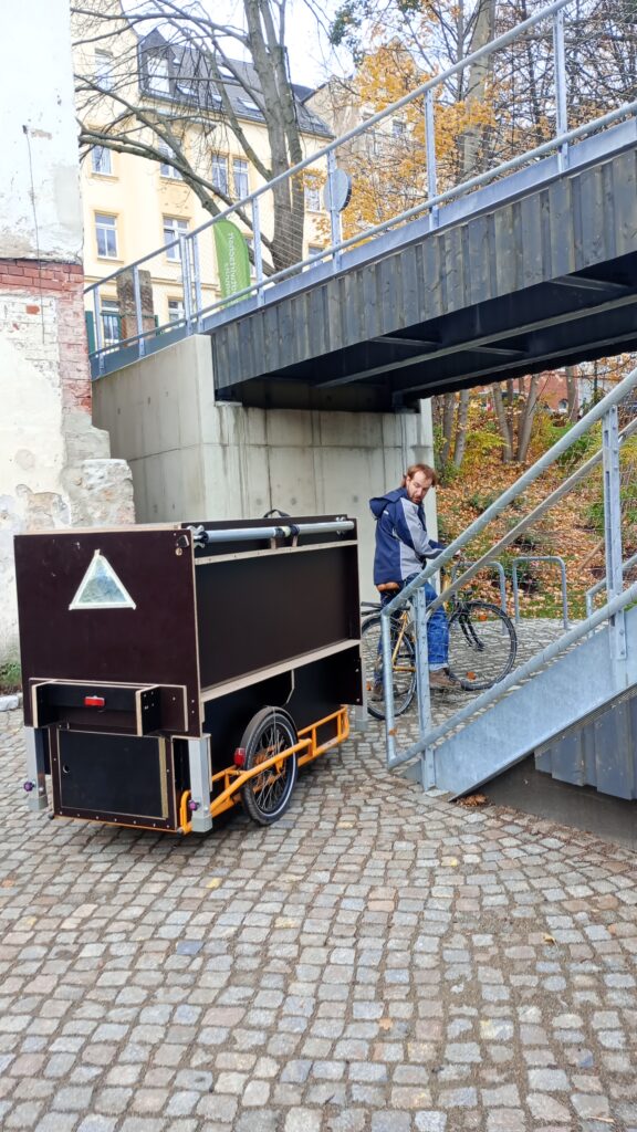 Mit dem elektrischen CO2-neutralen Lastenfahrradanhänger sind wir in der Lage, stadtweit unterwegs zu sein zu Aktionen, Festivals, Projekten oder Kooperationen.